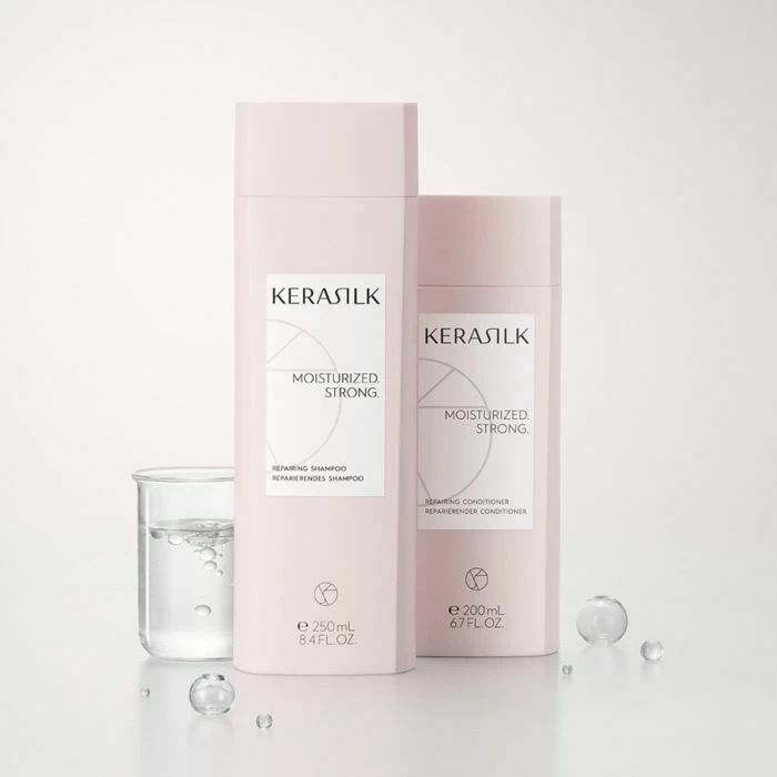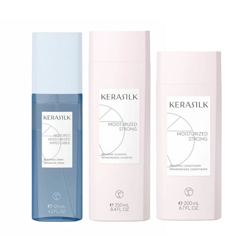 Breng een kleine hoeveelheid Kerasilk Repairing Shampoo aan op nat haar en masseer zachtjes in de hoofdhuid en door de lengtes. Spoel grondig uit. Vervolg met de Kerasilk Repairing Conditioner en verdeel deze gelijkmatig over het gewassen haar. Laat het een paar minuten inwerken en spoel het daarna uit. Spray ten slotte de Kerasilk Repairing Spray op handdoekdroog haar en kam het door voor gelijkmatige verdeling. Niet uitspoelen.