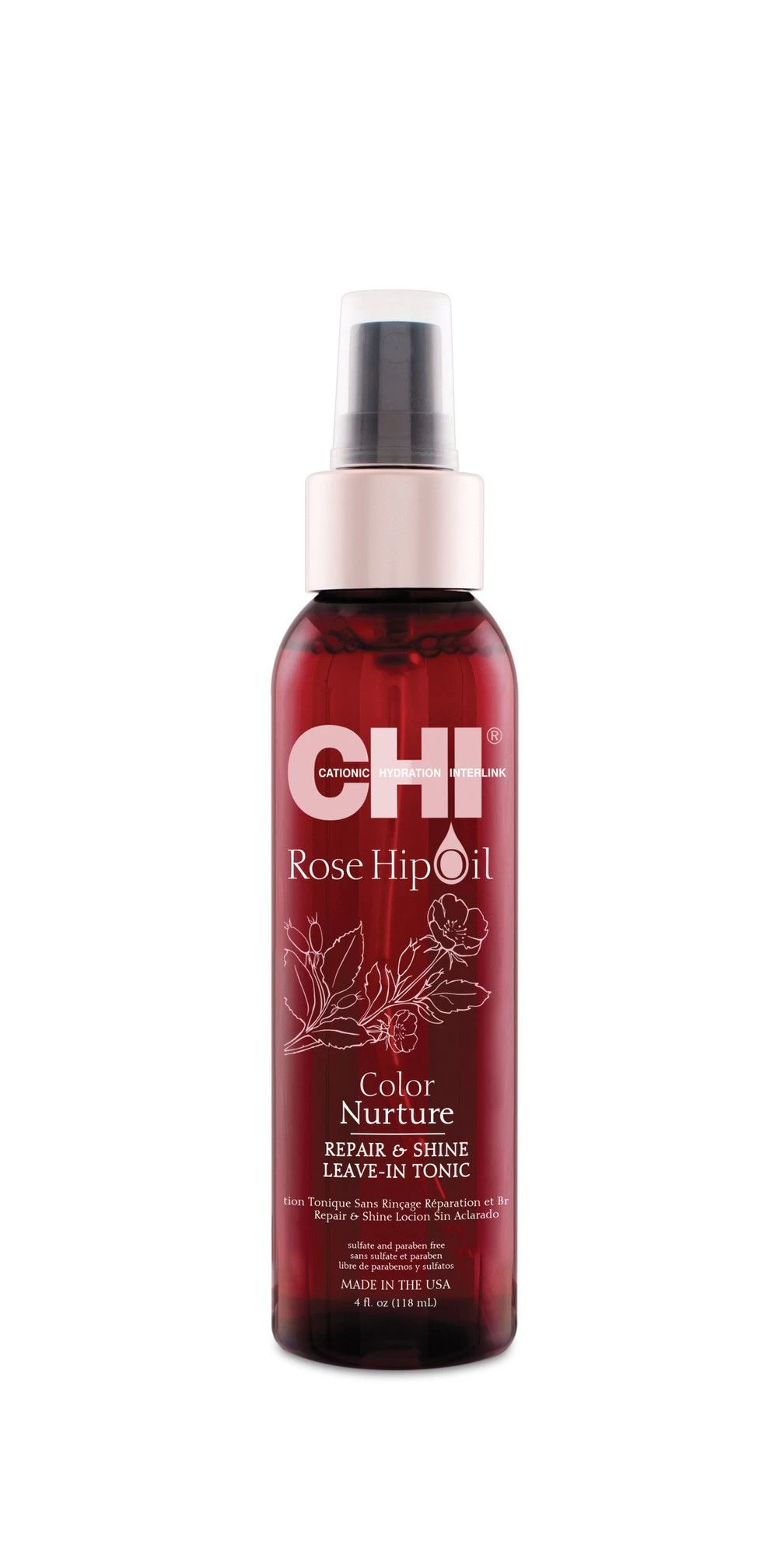 De Rose Hip Oil Repair & Shine Leave-in Tonic van CHI licht conditionerende haartonic met vitamines die gekleurd haar verrijkt, voorafgaand de styling. De kalmerende formule versterkt en hydrateert gekleurd haar en helpt kroes en statisch haar te voorkomen.