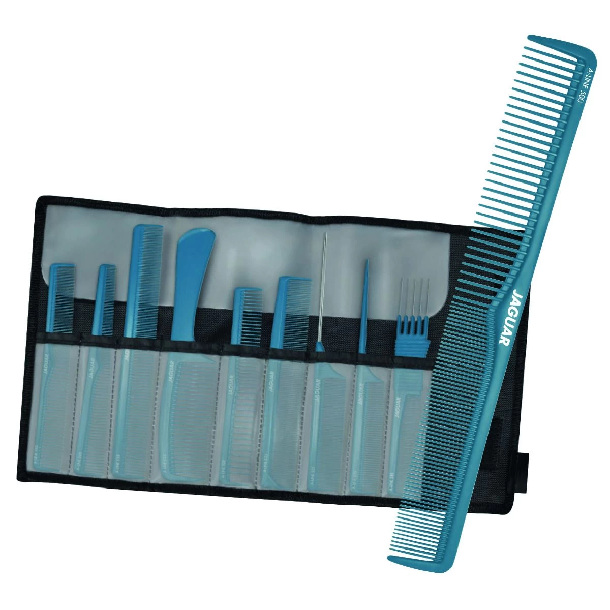 De Jaguar A-Line Kammenset bevat 3 verschillende knipkammen, 1 handvatkam, 2 onduleerkammen, 2 puntkammen en 1 vorkkam in de gave kleur Atlantic.