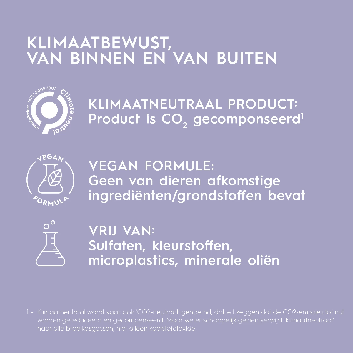 - Vrij van sulfaten, kleurstoffen, microplastics en minerale oliën
