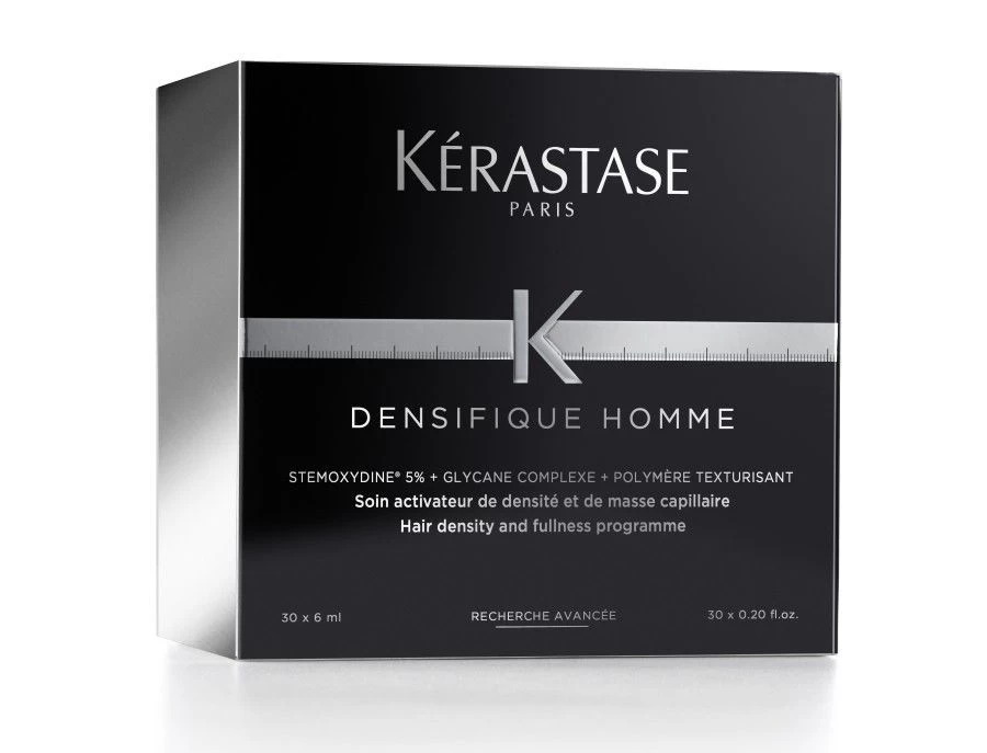 Kérastase creëerde een 3 stappen schoonheidsroutine: reinigen, behandelen en texturize. Met de doordachte methoden kun je een salon behandeling nu ook thuis ervaren. De Kérastase Densifique Homme Coffret á 30 30x6ml behoort tot de tweede stap van de schoonheidsroutine. Het is klinisch bewezen dat de haarvezel versterkt wordt en dat het haar dikker aanvoelt. Uit onderzoek blijkt dat 80% van de gebruikers het gevoel had dat hun haar sterker was geworden. De leave-in bevat de molecule Stemoxydine die gecombineerd is met Complex Glycan en deze ingrediënten zorgen ervoor dat de haardichtheid vergroot wordt.
