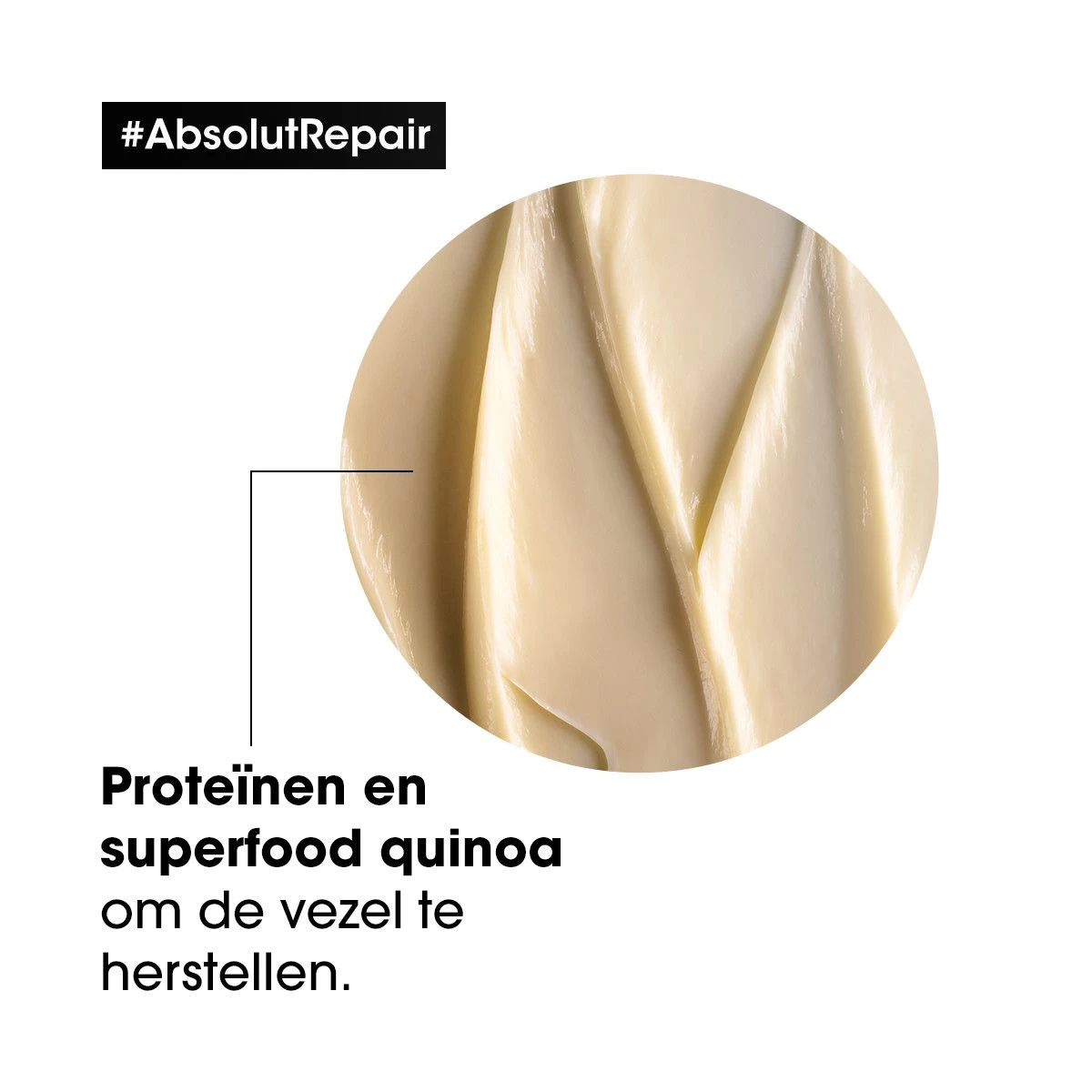 De L’Oréal Serie Expert Absolut Repair Gold is dé nummer 1 haarhersteller. Elke haarvezel wordt intensief gevoed en hersteld. De Serie Expert Absolut Repair Gold volgt namelijk een super trend: GOUD; van een luxe icoon naar een social trend in beauty. Deze nieuwe lijn bevat Quinoa, dit ingrediënt zorgt ervoor dat het haar direct sterker en glanzender word. Dankzij de co-emulsie technologie wordt het haar hersteld zonder het te verzwaren.