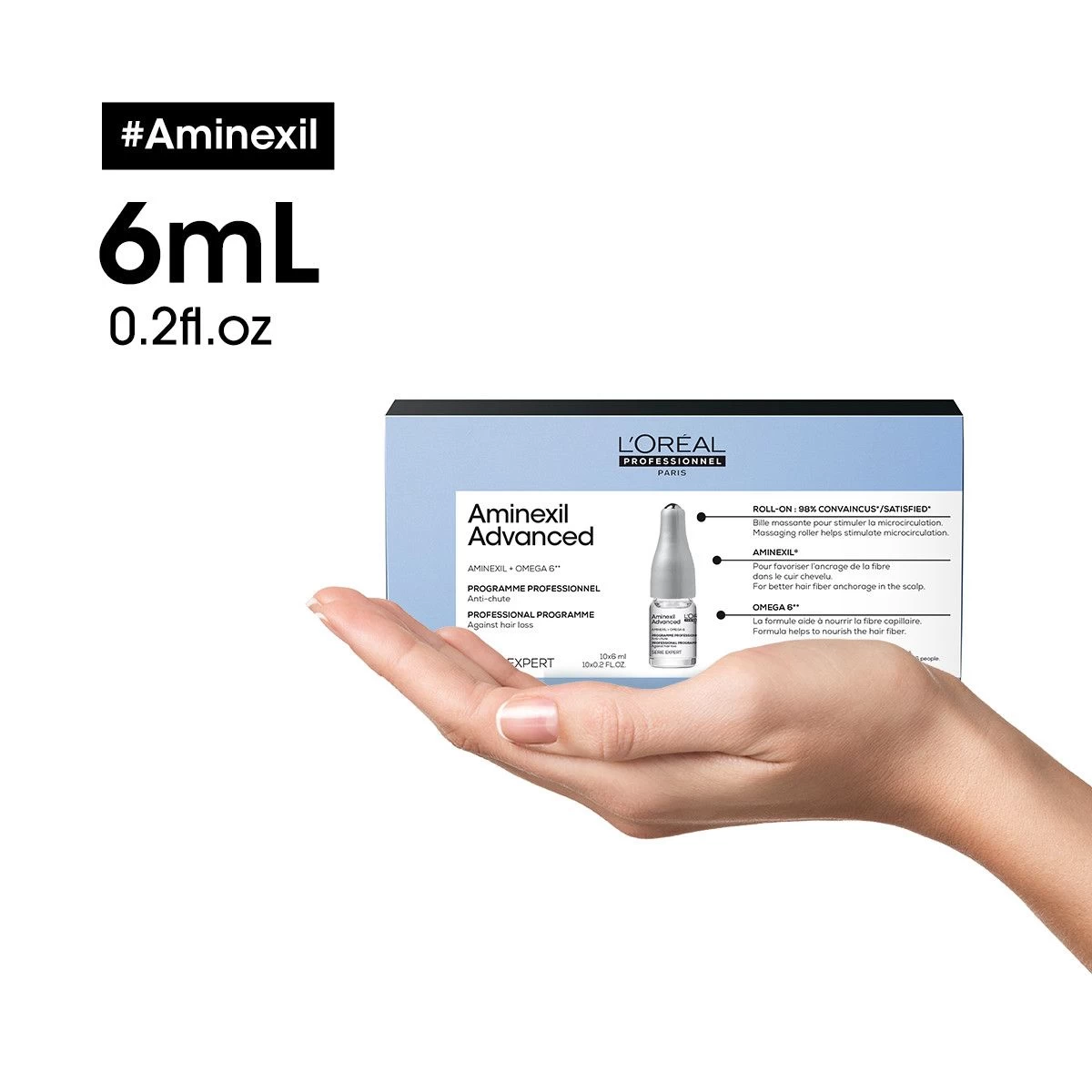 De L’Oréal Serie Expert Aminexil Advanced 10x 6ml is een anti-haaruitvalprogramma. Het product bevat Aminexil en een Omega 6 bestanddelen, het is wetenschappelijk bewezen dat dit product werkt. De Aminexil gaat verharding van het collageen tegen. Het collageen is het stofje dat zit opstapelt bij het haarzakje, hierdoor wordt de hechting van de haarwortel verhindert. Bij het gebruik van de L’Oréal Serie Expert Aminexil Advanced 10x 6ml heb je last van minder haaruitval. De Omega 6 zorgt ervoor dat het haar vanaf de wortel gestimuleerd wordt te groeien. Binnen 42 dagen geeft het product 8000 haren langer leven en krijgt het haar meer volume en sterkte.