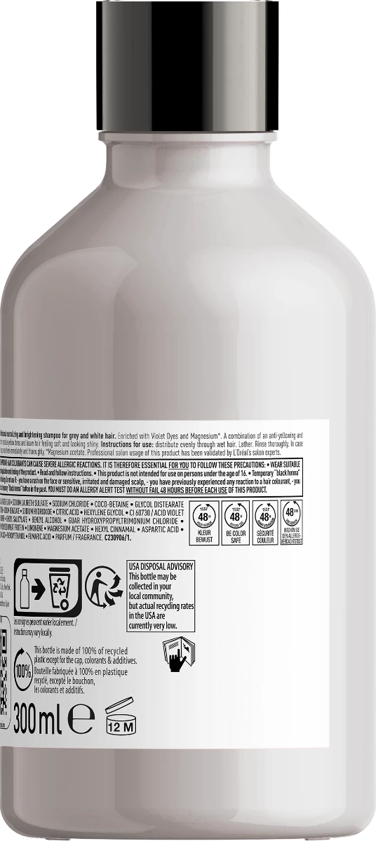 L’Oréal Serie Expert Silver Shampoo 300ml is een shampoo die speciaal gemaakt is voor haar dat toe is aan een opfrissing zónder hier verf voor te gebruiken. De shampoo haalt ongewenste geel- en kopertinten uit het haar en zorgt ervoor dat witte en grijze weer stralen! Deze zilvershampoo laat meteen resultaat zien. Gebruik de shampoo net zo veel, en zo vaak, totdat je het gewenste resultaat hebt bereikt!
