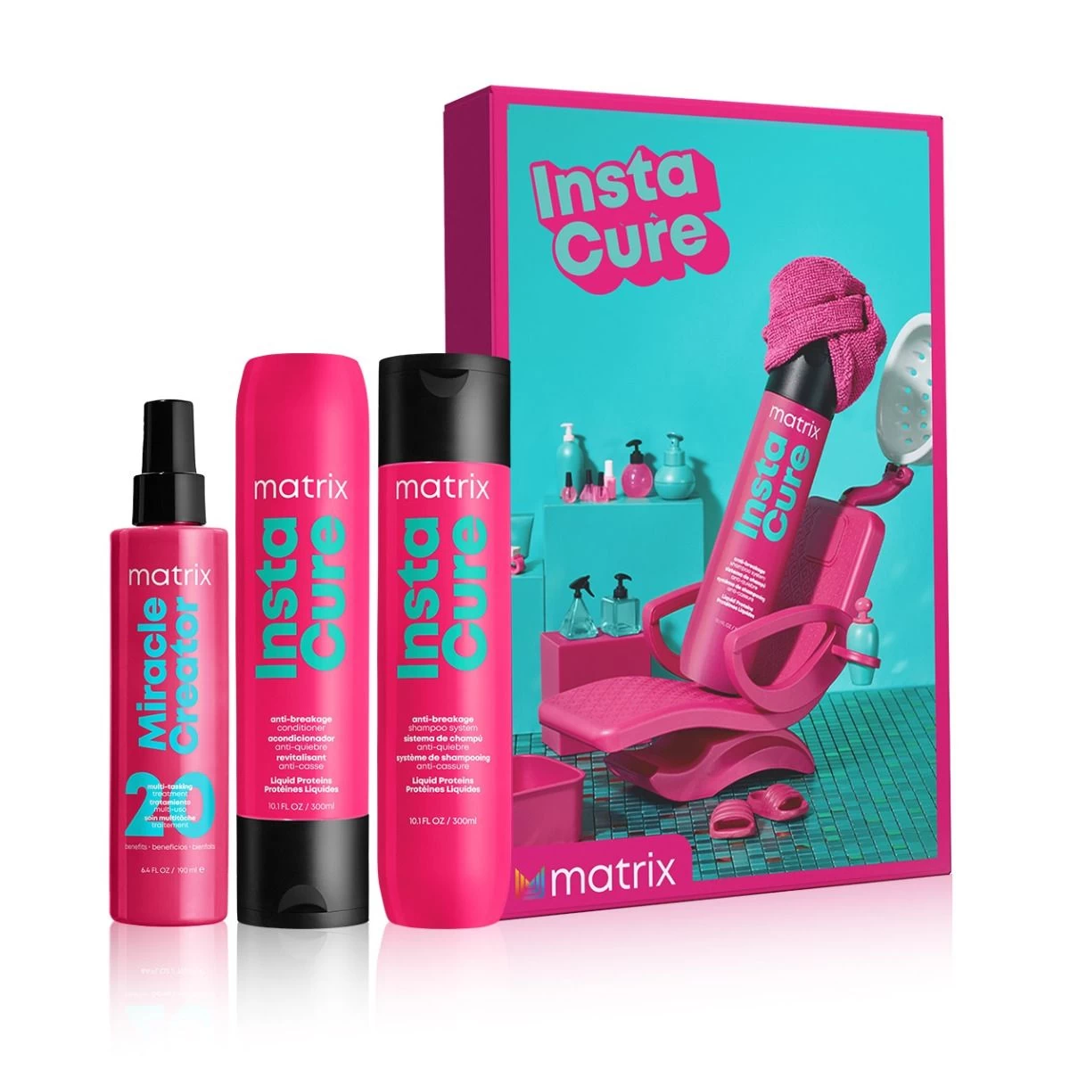 De Matrix Instacure Giftset bevat de Instacure Shampoo, Instacure Conditioner en Miracle Creator Spray.