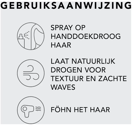 Gebruik: breng de spray gelijkmatig aan op vochtig haar en laat het natuurlijk drogen voor golvend haar of gedefinieerde krullen. Inhoud verpakking: 150 ml.